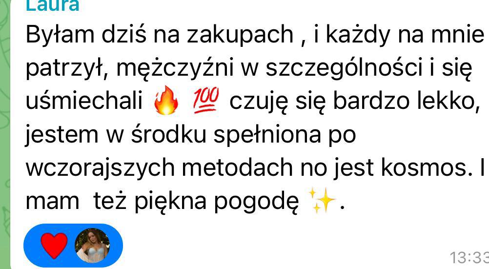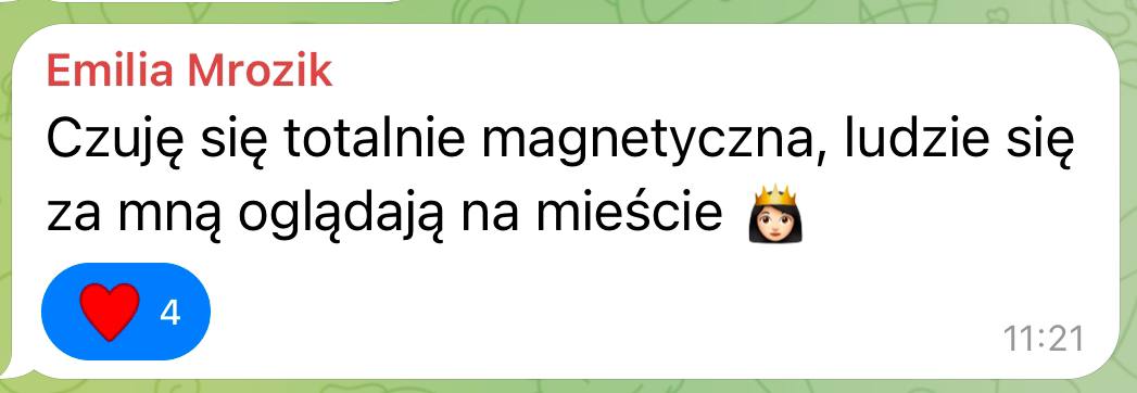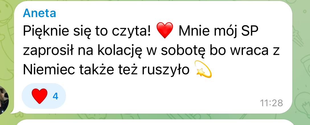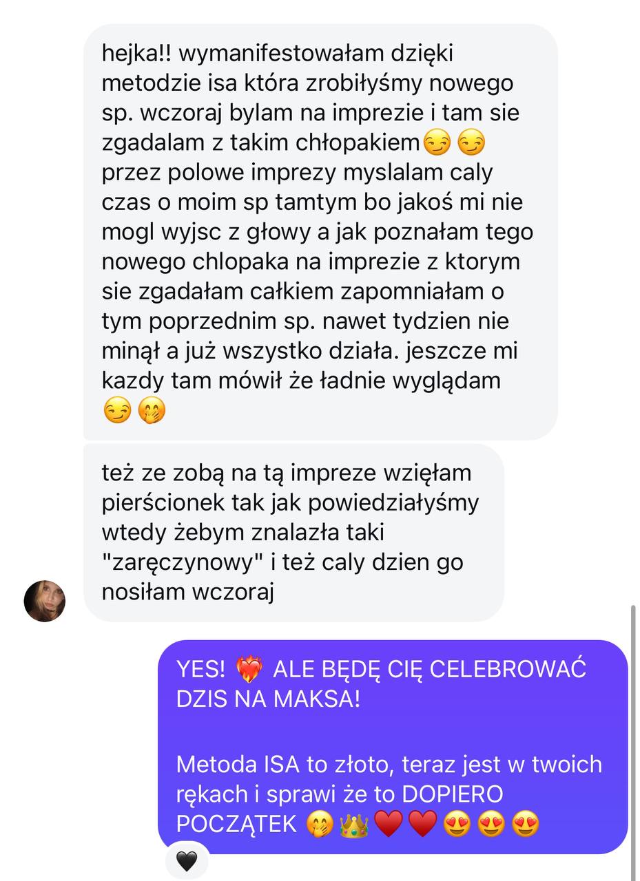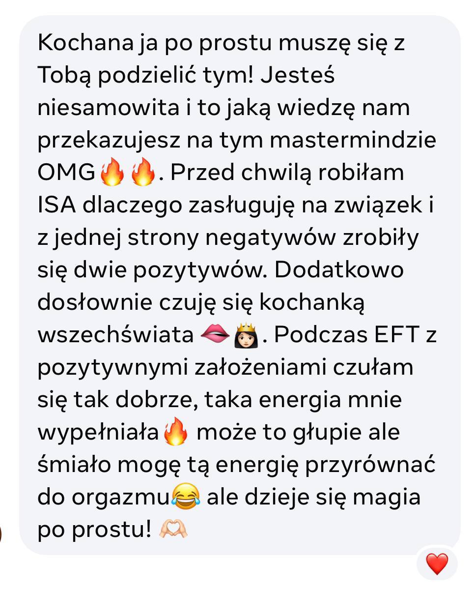 Kiedy przestajesz żyć z poziomu braku, gonienia z desperacji i zaniżonych standardów, zmiana zaczyna odbijać się szerzej – w tym, co dopuszczasz do relacji,pieniędzy, codzienności i własnego życia. Dlatego na wyższych etapach moich przestrzeni pracujemy również z obfitością, standardem życia i biznesem, aby twoja rzeczywistość zmieniała się całościowo, a nie tylko w jednym obszarze.